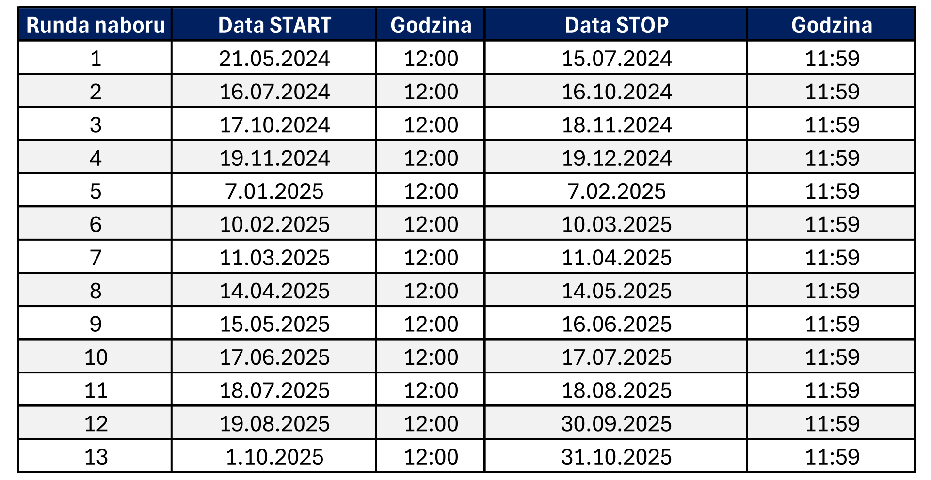 Zakładamy, że każdy nabór będzie trwał średnio dwa tygodnie. Terminy rozpoczęcia każdego z naborów będziemy podawać do publicznej wiadomości w szczególności poprzez zamieszczenie ogłoszenia na stronie projektu w zakładce Aktualności oraz na Facebooku projektu. Informację o dacie rozpoczęcia i trwania naboru będziemy udostępniać nie później, niż na 7 dni przed jego rozpoczęciem.